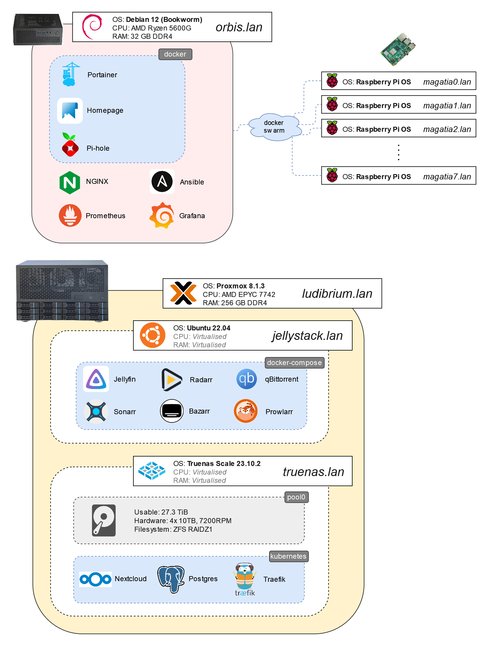 'Ludibrium', is a 5U rack-mount x86 machine that would all the user/public-facing services and should have enough hardware resources to support that. It also handles hard-drives.